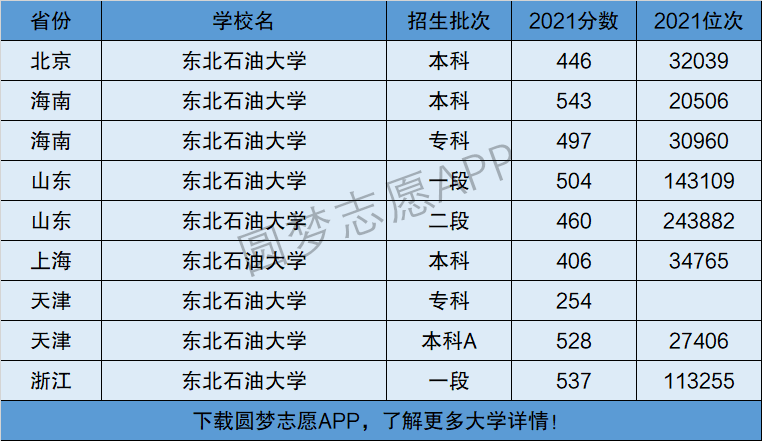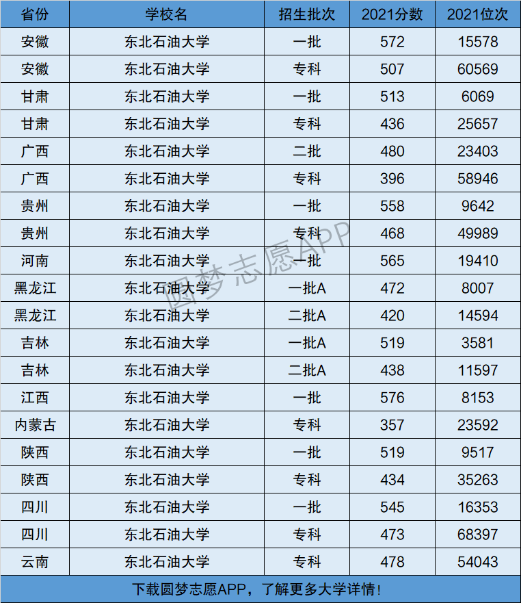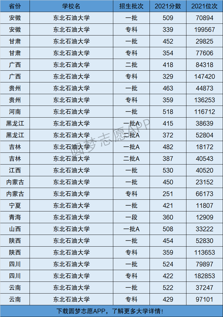 下面将为大家展示东北石油大学2021年在全国各省市的最低分数线和位次,大家可以在了解东北石油大学在全国各省详细招生批次的同时,也顺便看看东北石油大学的招生录取分数线是多少!