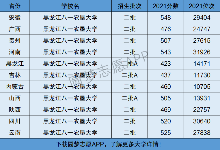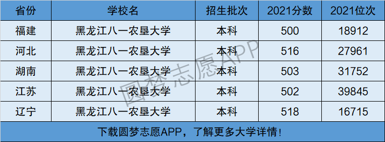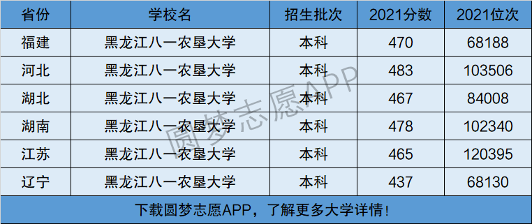 下面将为大家展示黑龙江八一农垦大学2021年在全国各省市的最低分数线和位次,大家可以在了解黑龙江八一农垦大学在全国各省详细招生批次的同时,也顺便看看黑龙江八一农垦大学的招生录取分数线是多少!