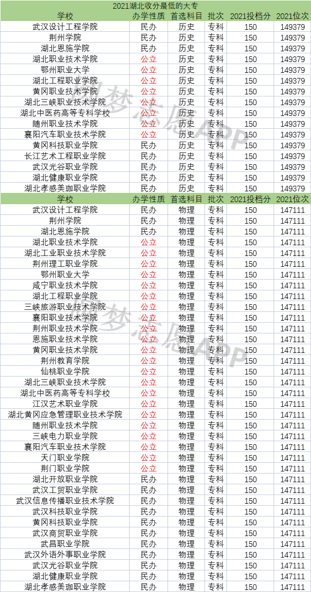 2021年湖北收分最低的大专名单一览表: