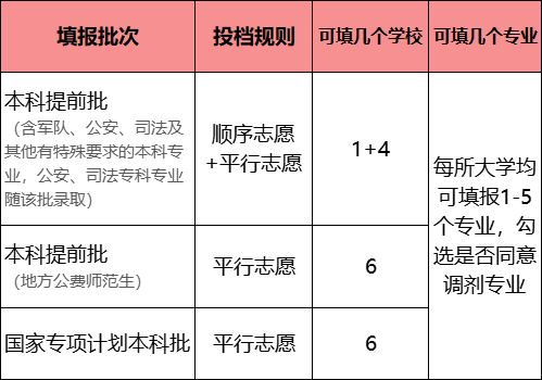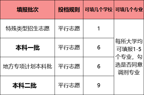1、可填批次:特殊类型招生志愿、本科一批、地方专项计划本科批、本科二批