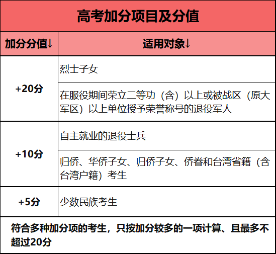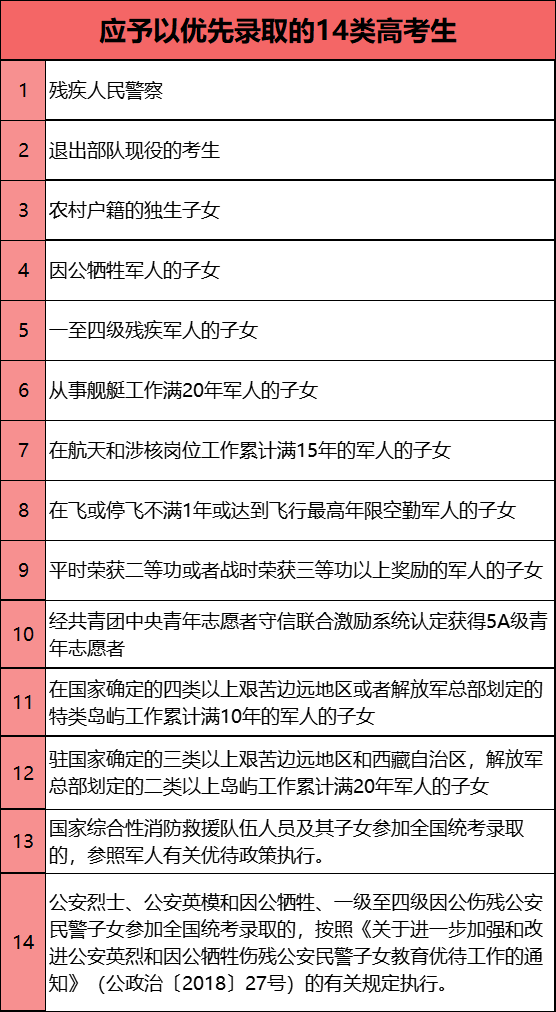 以下考生,参加全国统考录取并达到有关高校投档要求的,在与其他考生同等条件下,应予以优先录取。