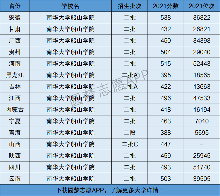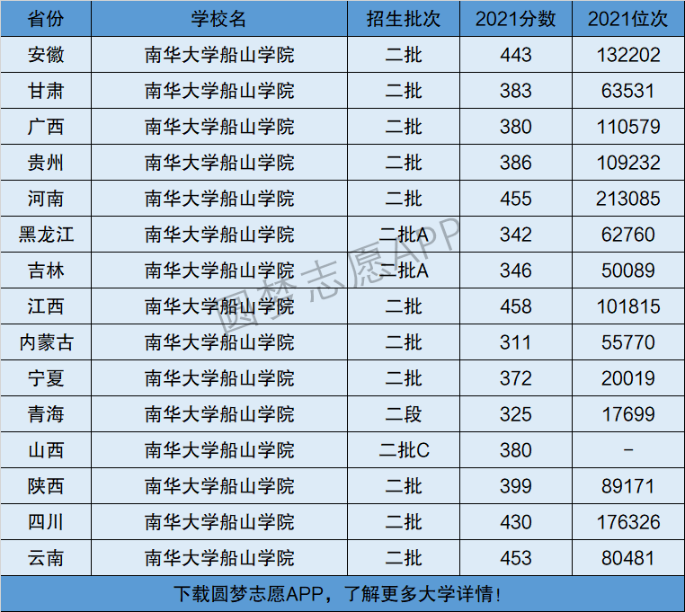 2、南华大学船山学院在全国普通高考省份的【理科】招录数据,包含招生批次等信息: