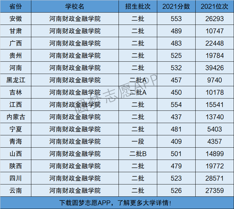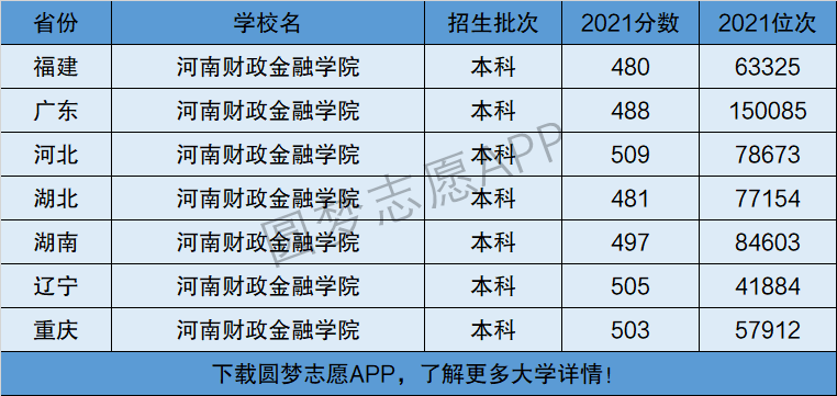 下面将为大家展示河南财政金融学院2021年在全国各省市的最低分数线和位次,大家可以在了解河南财政金融学院在全国各省详细招生批次的同时,也顺便看看河南财政金融学院的招生录取分数线是多少!