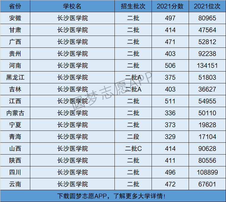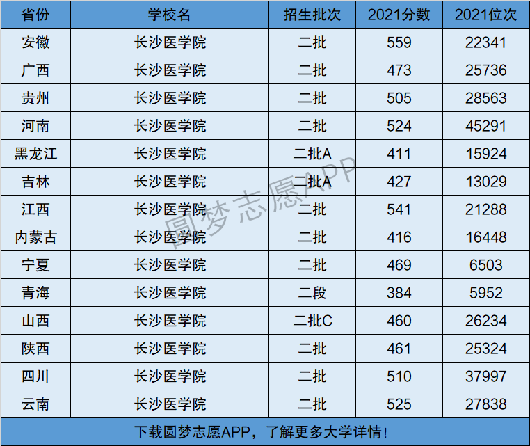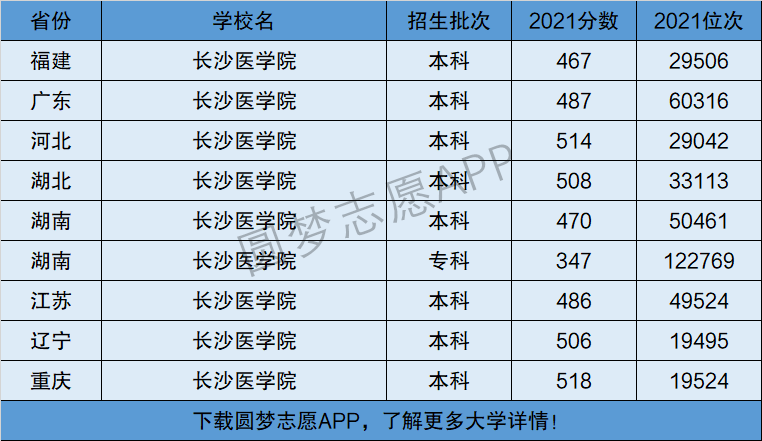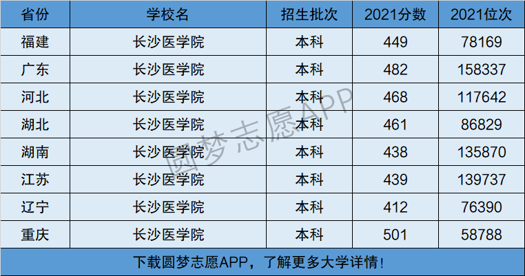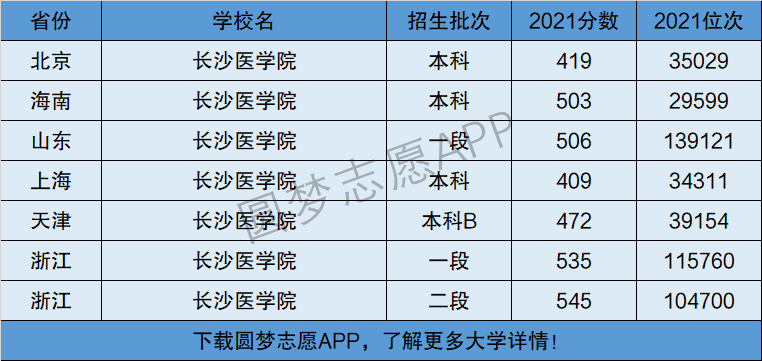 下面将为大家展示长沙医学院2021年在全国各省市的最低分数线和位次,大家可以在了解长沙医学院在全国各省详细招生批次的同时,也顺便看看长沙医学院的招生录取分数线是多少!