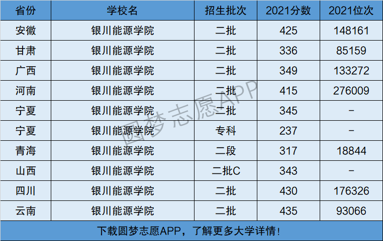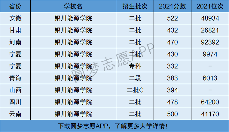 据悉,银川能源学院2021年高考在全国12个省市均有招生,在其中8个省份为本科二批招生,在其中已经合并了一本二本的2个省份中均为本科批招生,在山东省的一段招生。