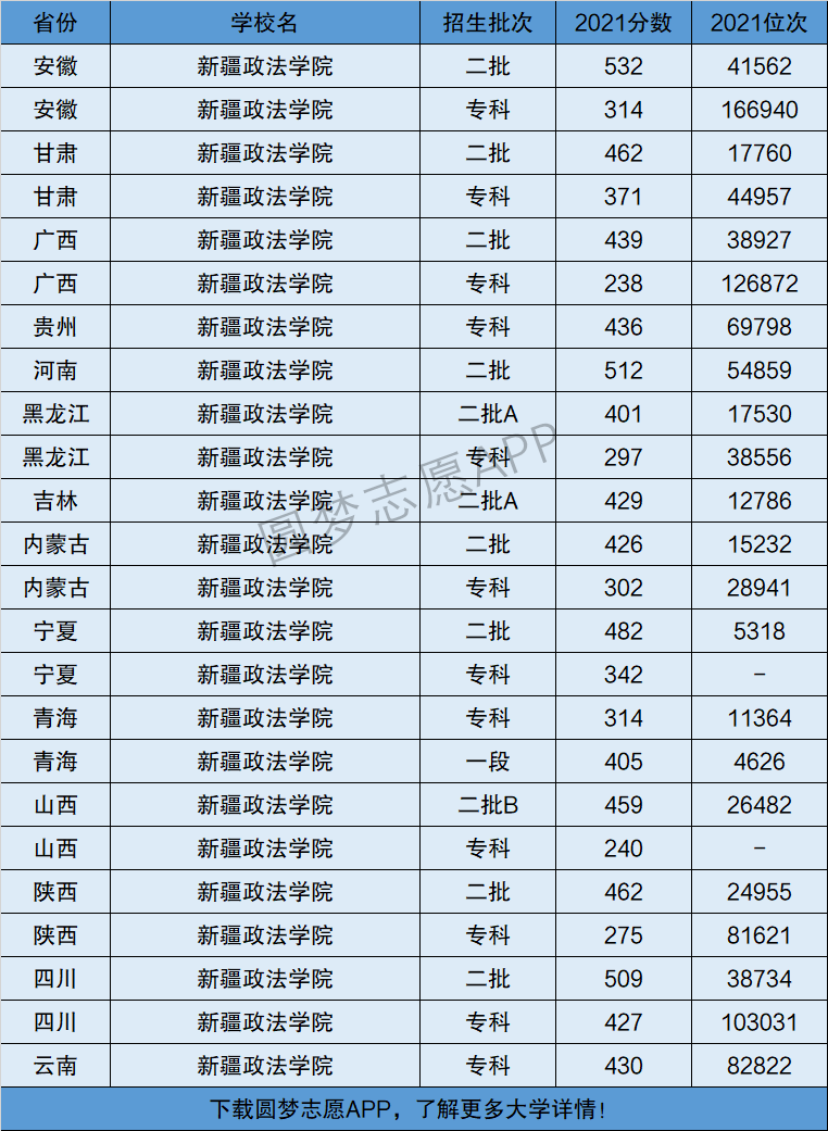 下面将为大家展示新疆政法学院2021年在全国各省市的最低分数线和位次,大家可以在了解新疆政法学院在全国各省详细招生批次的同时,也顺便看看新疆政法学院的招生录取分数线是多少!