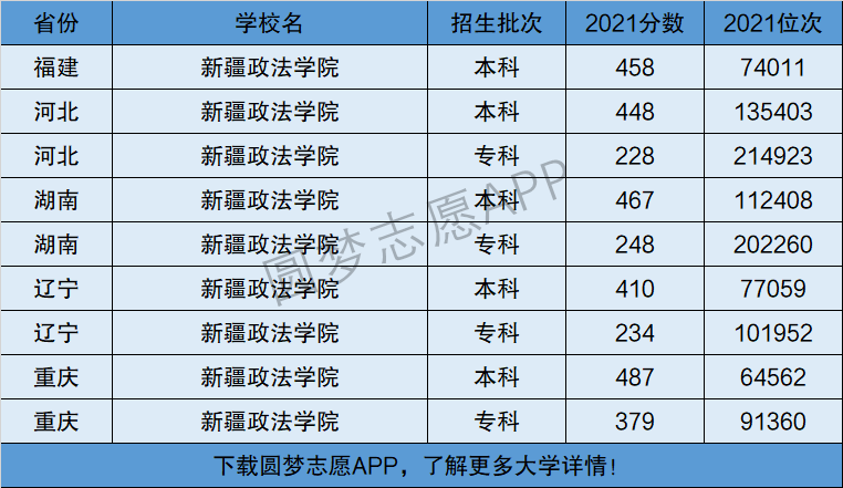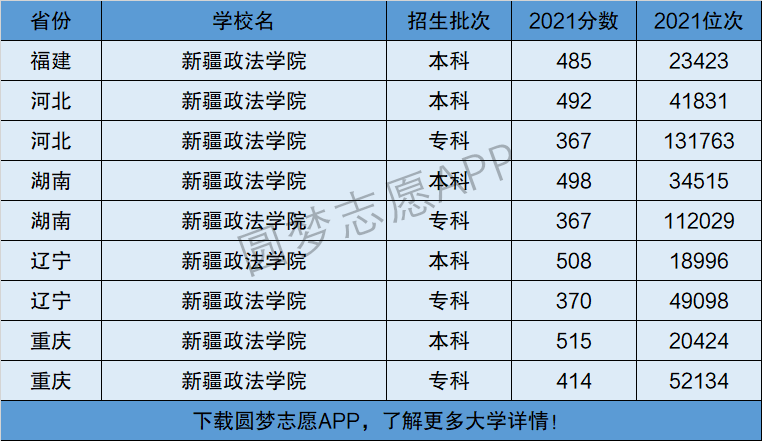 据悉,新疆政法学院2021年高考在全国18个省市均有招生,在其中11个省份为本科二批招生,在其中已经合并了一本二本的5个省份中均为本科批招生,在青海、山东省的一段招生。