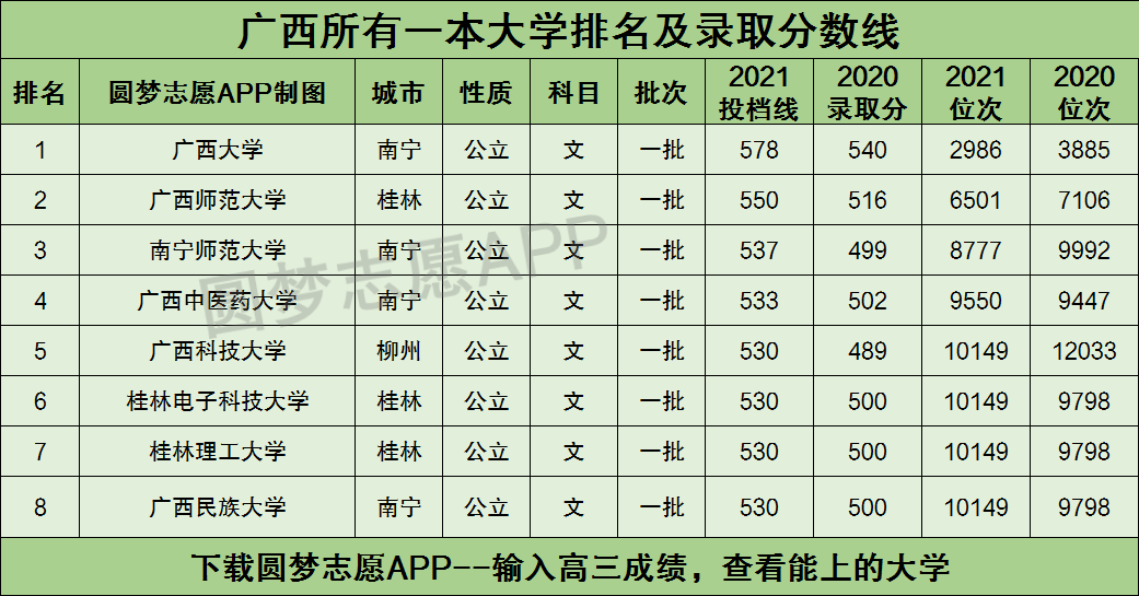 一、广西所有一本大学排名及录取分数线2021文科