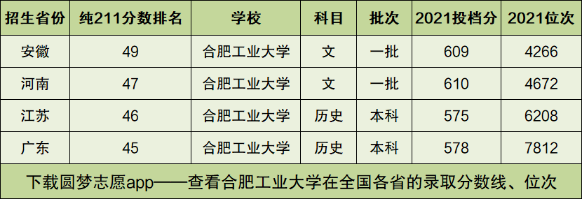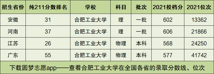 合肥工业大学在江苏、广东省2021年首选物理、历史的最低投档分数线、位次可见下图。同样地,小编也根据投档分数线的高低为大家整理出了江苏、广东版本的合肥工业大学在纯211大学中的排名!