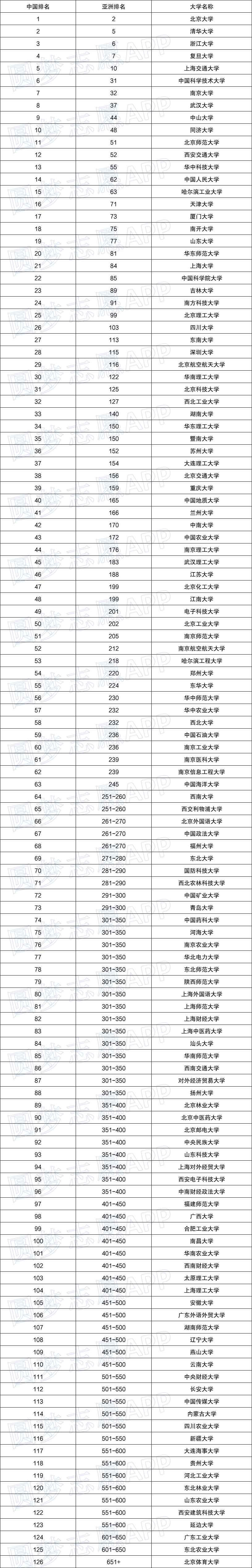 早在2021年11月2日,QS就发布了《2022亚洲大学排行榜》,中国一共有183所大学上榜,其上榜大学的数量在亚洲排第一,而中国内地上榜的大学数量为126,下图即是QS2022亚洲大学排名(中国内地大学排名名单):