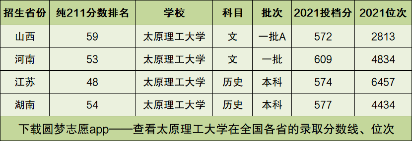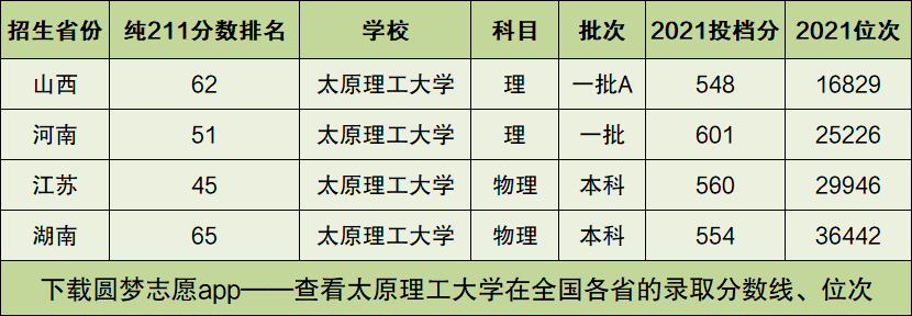 下文中,小编将以“山西、河南、江苏、湖南”这四个省为例,为大家展示太原理工大学在全国所有的纯211大学中的录取分数线排名情况。