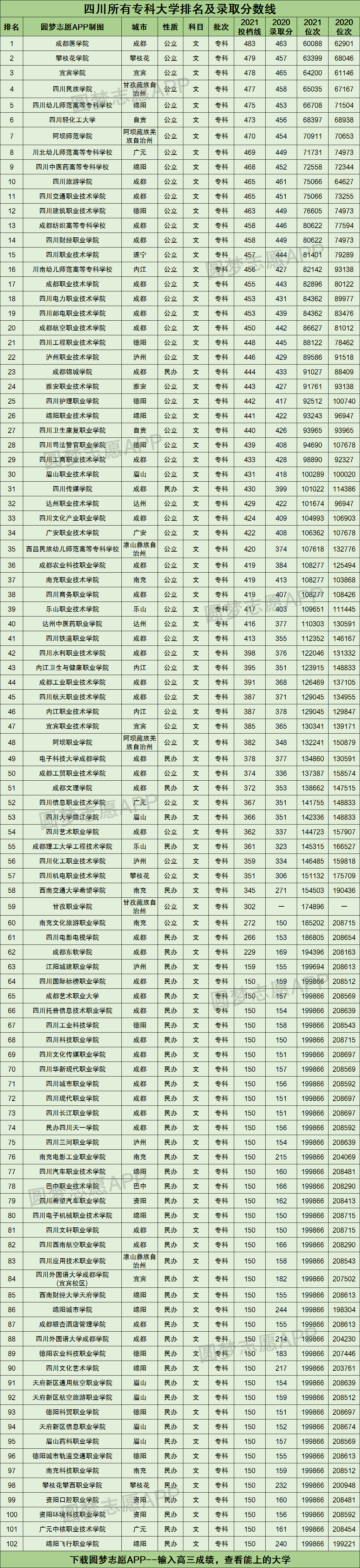 2021年高考四川省内所有专科大学排名及文科最低录取分数线、位次等数据,对于四川省2021年文科成绩在专科线以上的同学来说非常具有价值。本文就为大家整理了这份信息,希望能助力四川省内全部的文科专科高三同学圆梦大学!