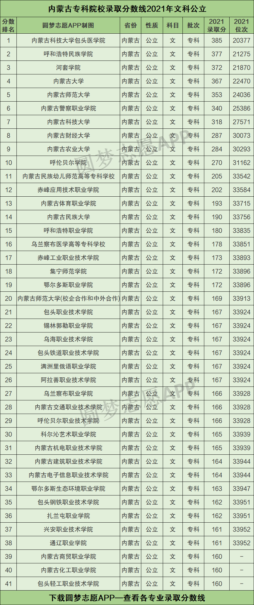 二、内蒙古专科院校录取分数线2021年排名(文科公立)