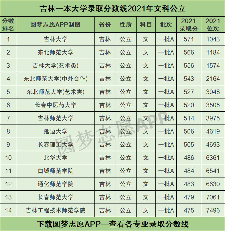 二、吉林一本大学录取分数线2021年排名(文科公立)