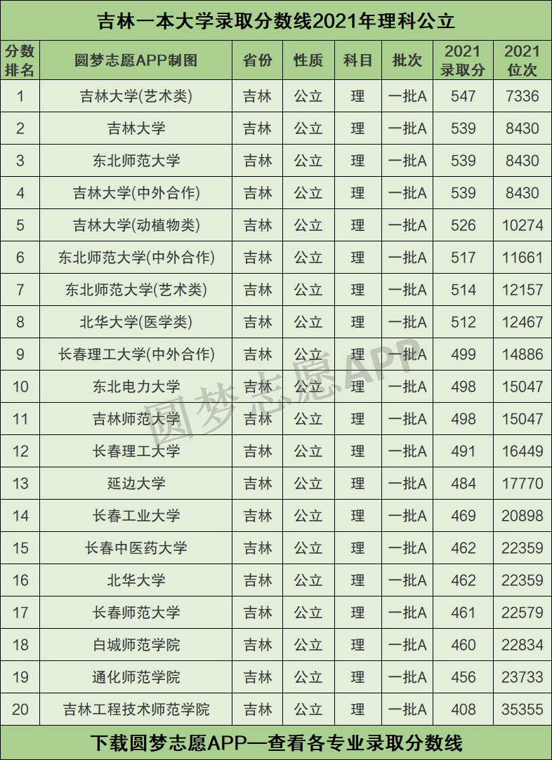 一、吉林一本大学录取分数线2021年排名(理科公立)