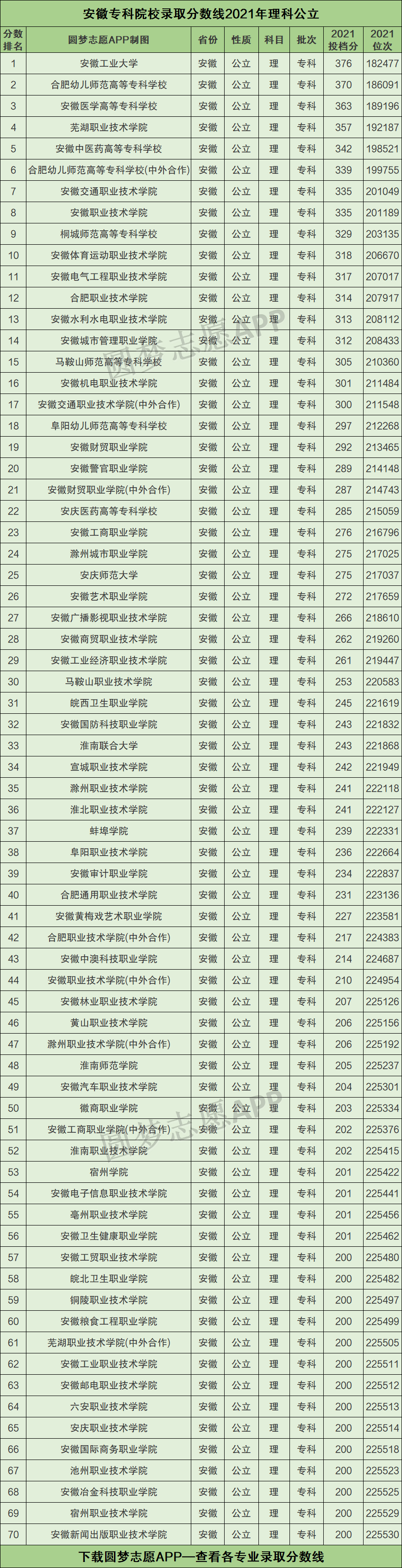 一、安徽专科院校录取分数线2021年排名(理科公立)
