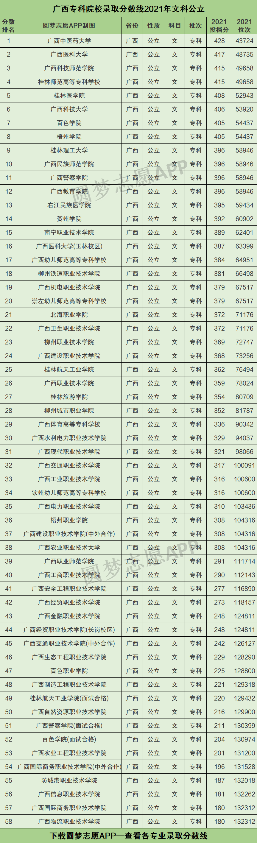 二、广西专科院校录取分数线2021年排名(文科公立)