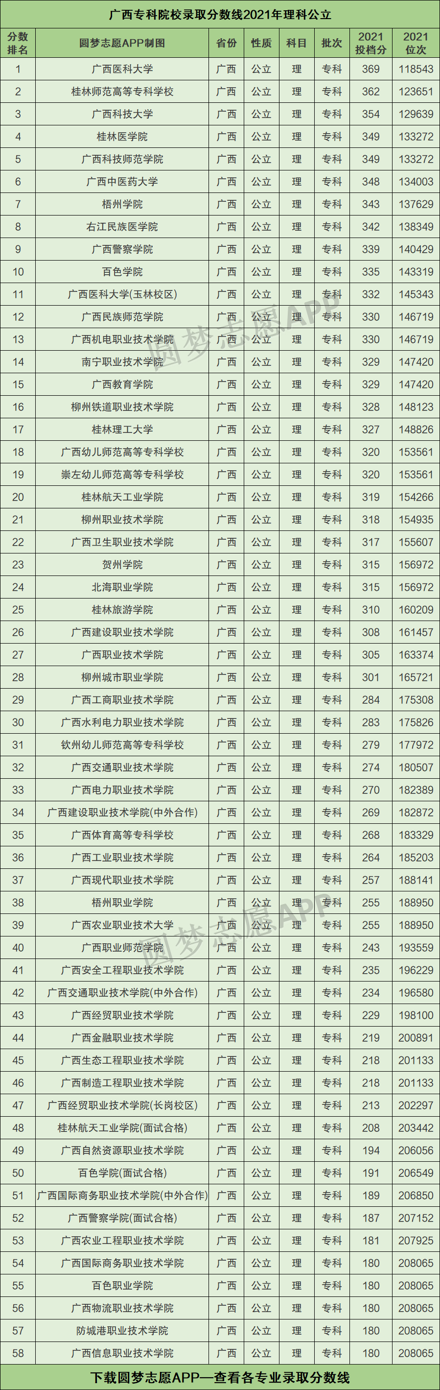 一、广西专科院校录取分数线2021年排名(理科公立)