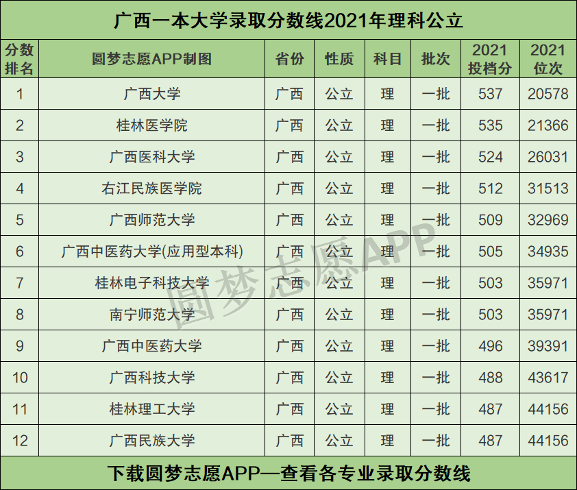 一、广西一本大学录取分数线2021年排名(理科公立)