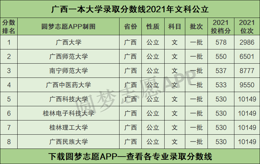 二、广西一本大学录取分数线2021年排名(文科公立)