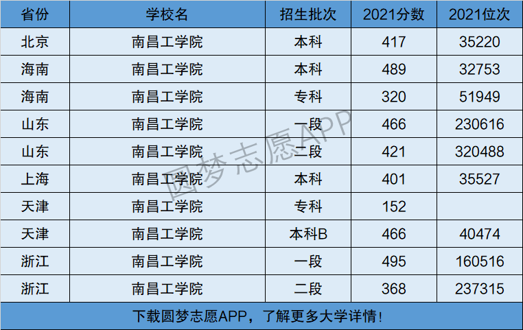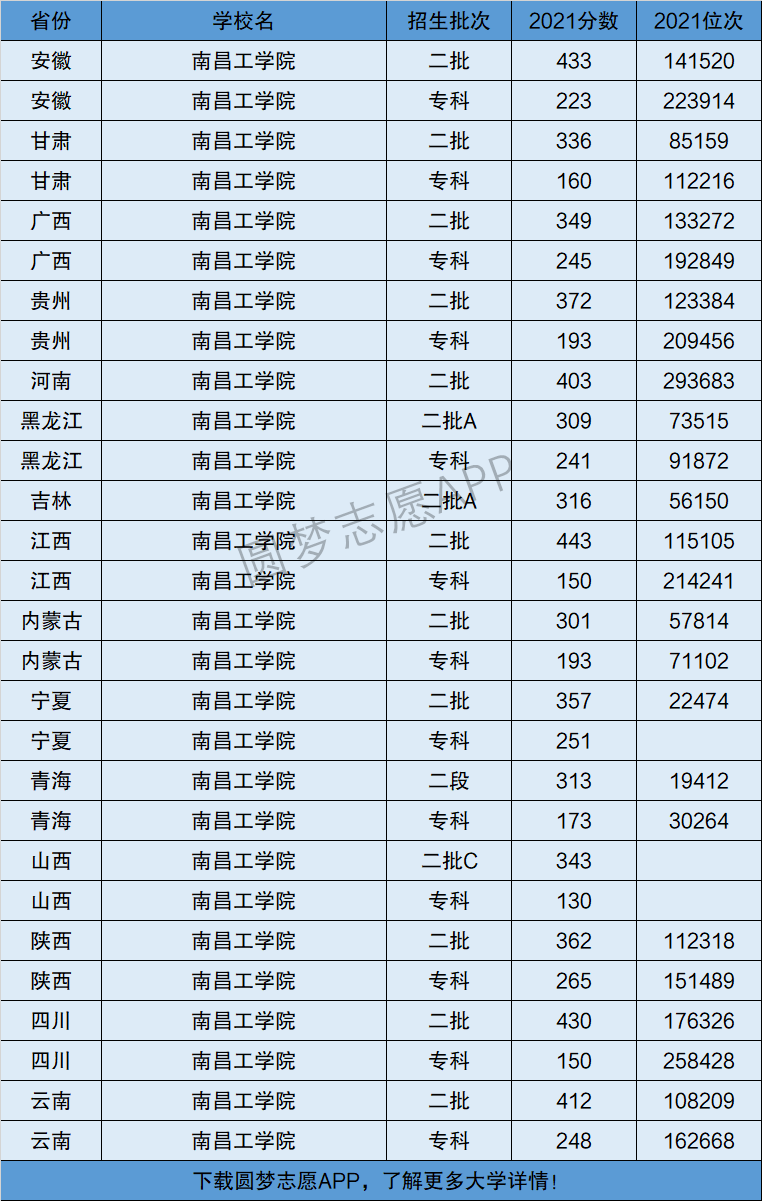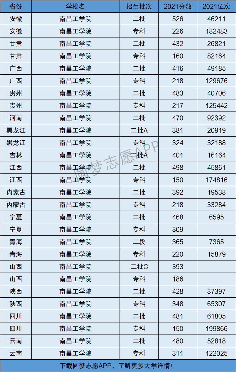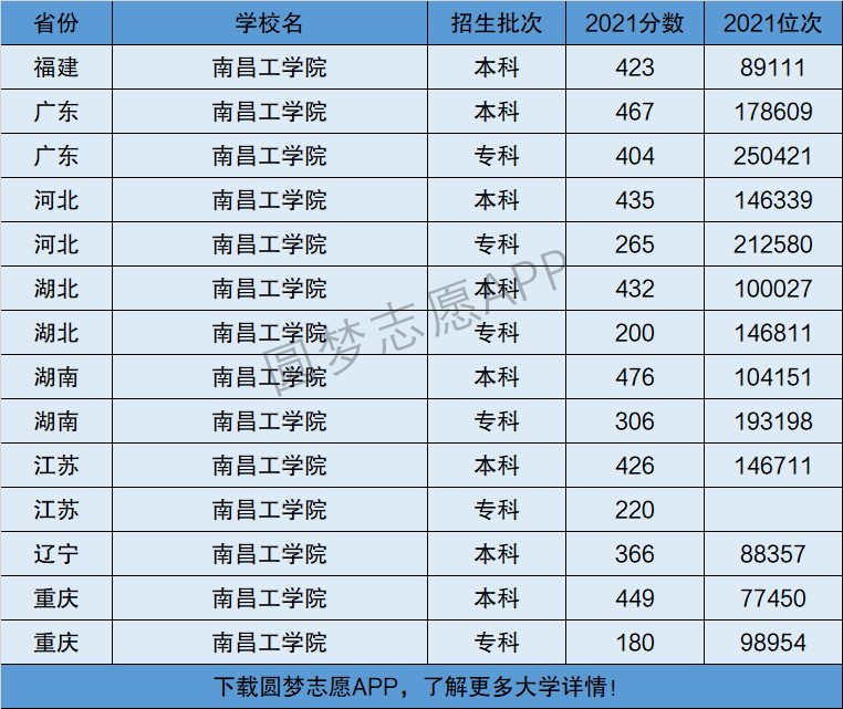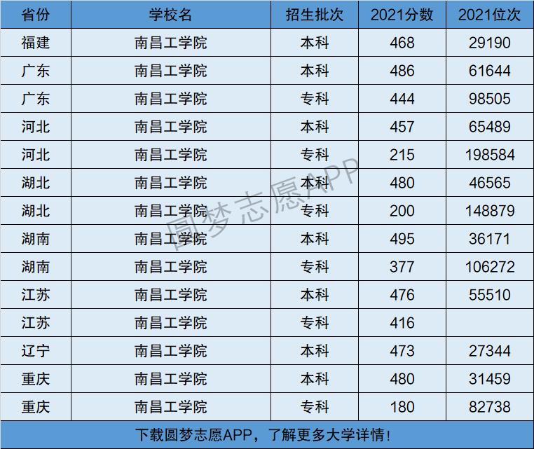下面将为大家展示南昌工学院2021年在全国各省市的最低分数线和位次,大家可以在了解南昌工学院在全国各省详细招生批次的同时,也顺便看看南昌工学院的招生录取分数线是多少!
