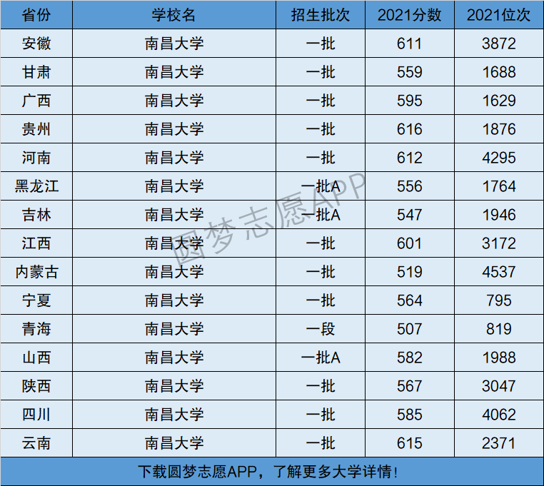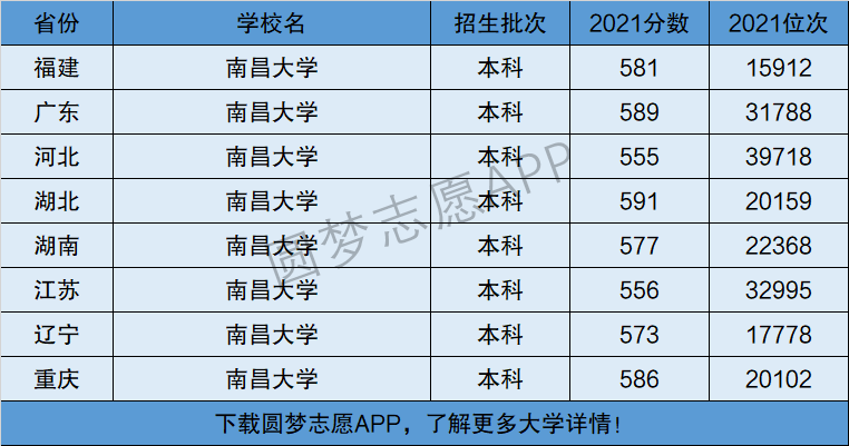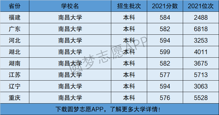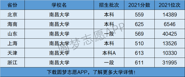 下面将为大家展示南昌大学2021年在全国各省市的最低分数线和位次,大家可以在了解南昌大学在全国各省详细招生批次的同时,也顺便看看南昌大学的招生录取分数线是多少!