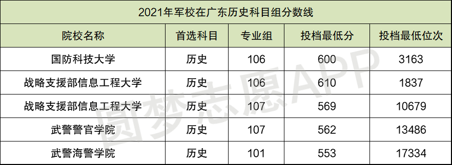 2021年在广东历史科目组收分最高的军校专业组是战略支援部信息工程大学106组,2021年的最低投档线为610分,位次为1837位;2021年在广东历史科目组收分最低的军校专业组是武警海警学院101组,2021年的最低投档线为553分,位次为17334位。