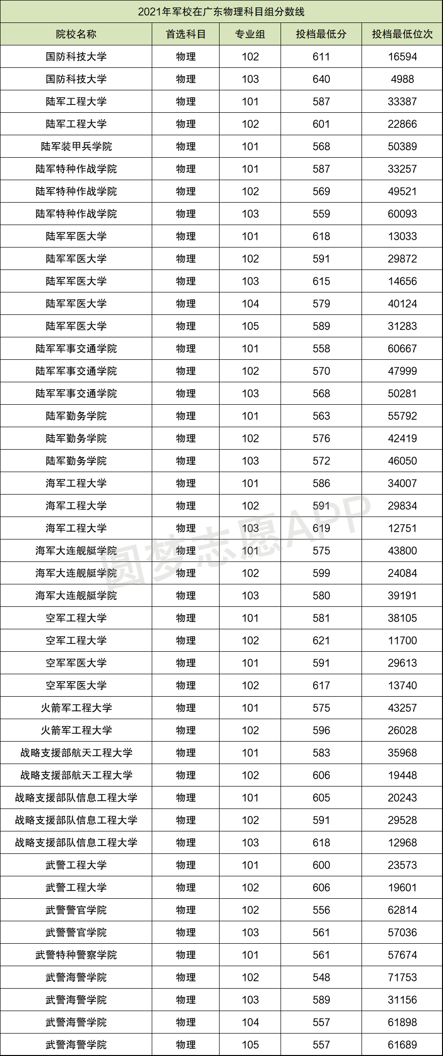 2021年在广东为例科目组收分最高的军校专业组是国防科技大学103组,2021年的最低投档线为640分,位次为4988位;2021年在广东历史科目组收分最低的军校专业组是武警海警学院102组,2021年的最低投档线为548分,位次为71753位。