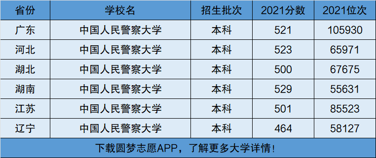 下面将为大家展示中国人民警察大学2021年在全国各省市的最低分数线和位次,大家可以在了解中国人民警察大学在全国各省详细招生批次的同时,也顺便看看中国人民警察大学的招生录取分数线是多少!