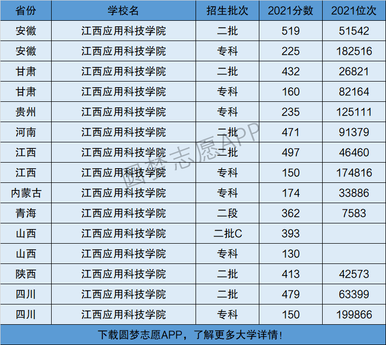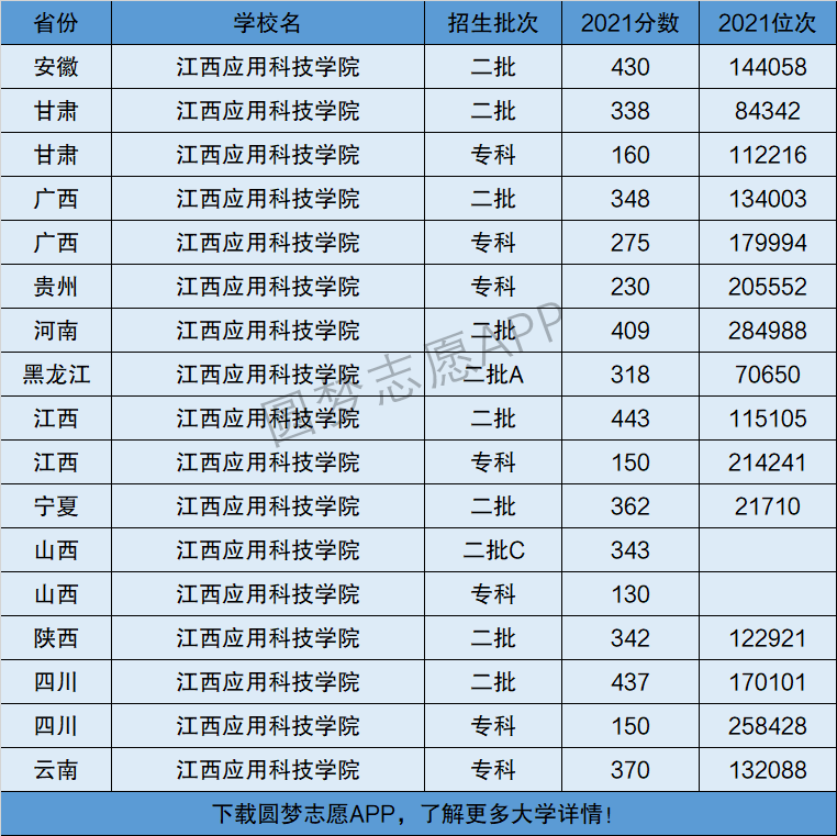 2、江西应用科技学院在全国普通高考省份的【理科】招录数据,包含招生批次等信息: