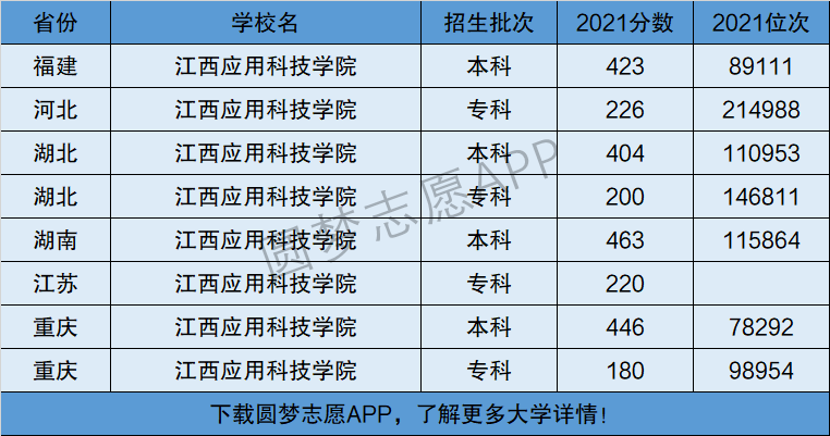 下面将为大家展示江西应用科技学院2021年在全国各省市的最低分数线和位次,大家可以在了解江西应用科技学院在全国各省详细招生批次的同时,也顺便看看江西应用科技学院的招生录取分数线是多少!