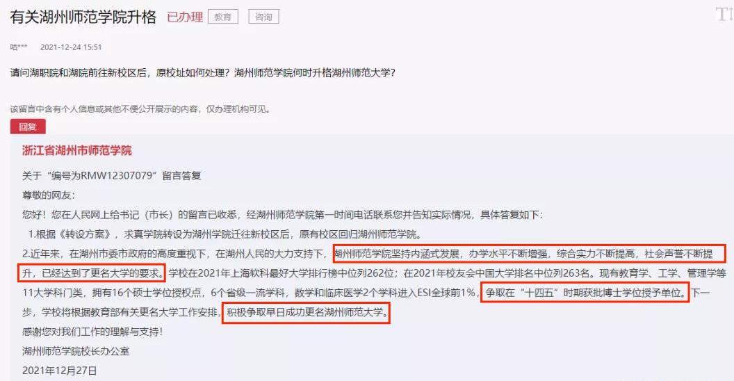 2021年12月24日,有网友在人民网留言板上问到:湖州师范学院何时能够升格为湖州师范大学?对于湖州师范学院也进行了回复。2021年12月27日,湖州师范学院官方回复称: