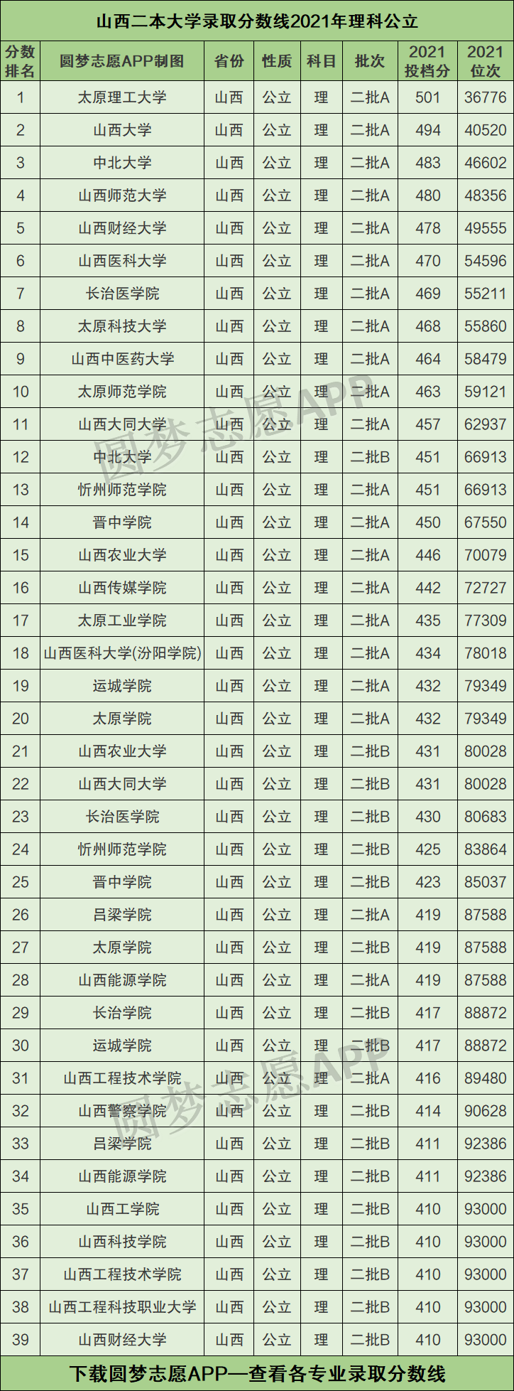 一、山西二本大学录取分数线2021年排名(理科公立)