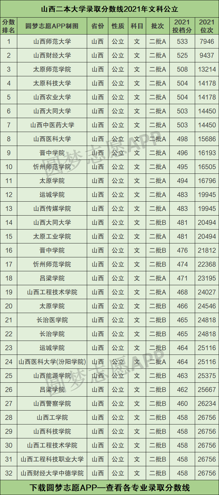 二、山西二本大学录取分数线2021年排名(文科公立)