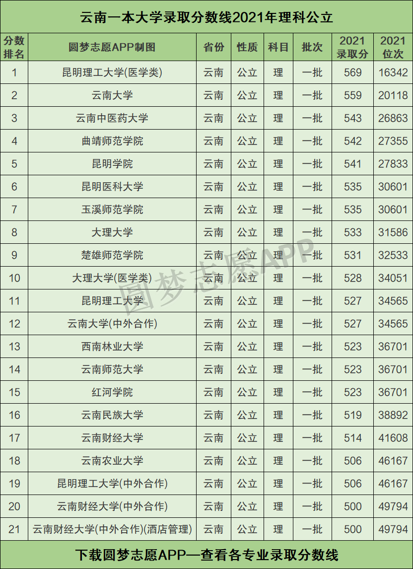 一、云南一本大学录取分数线2021年排名(理科公立)