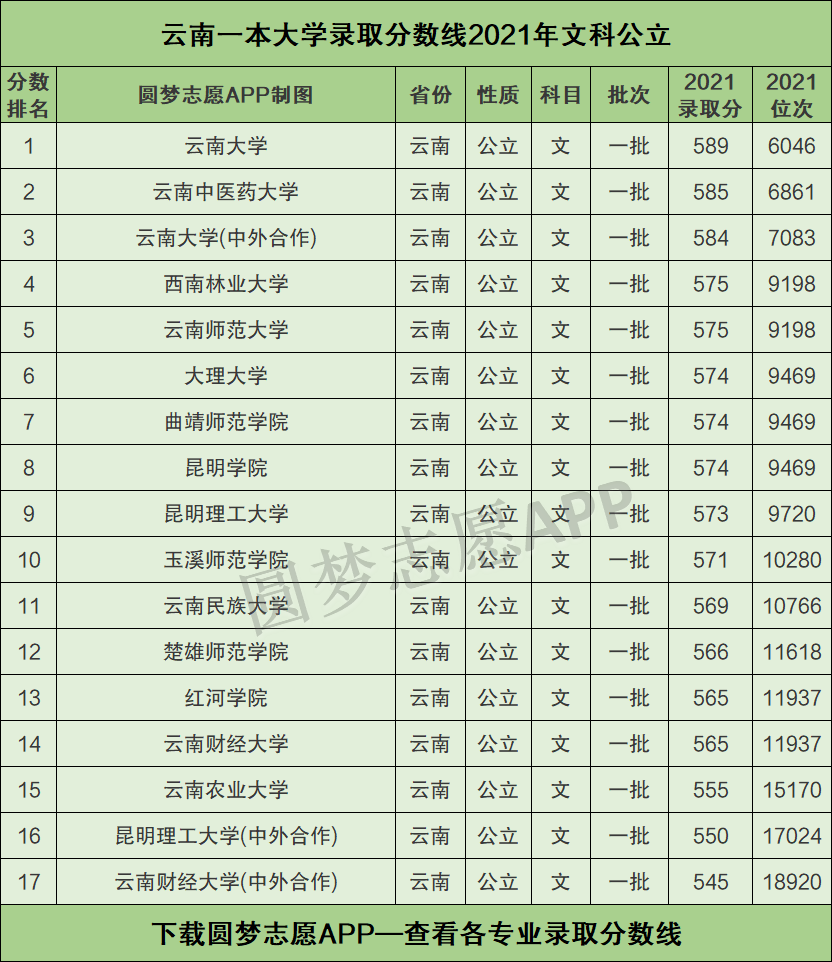 二、云南一本大学录取分数线2021年排名(文科公立)