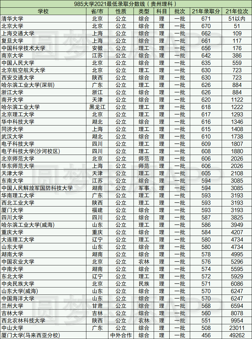 1、2021年985大学在贵州省录取最低分