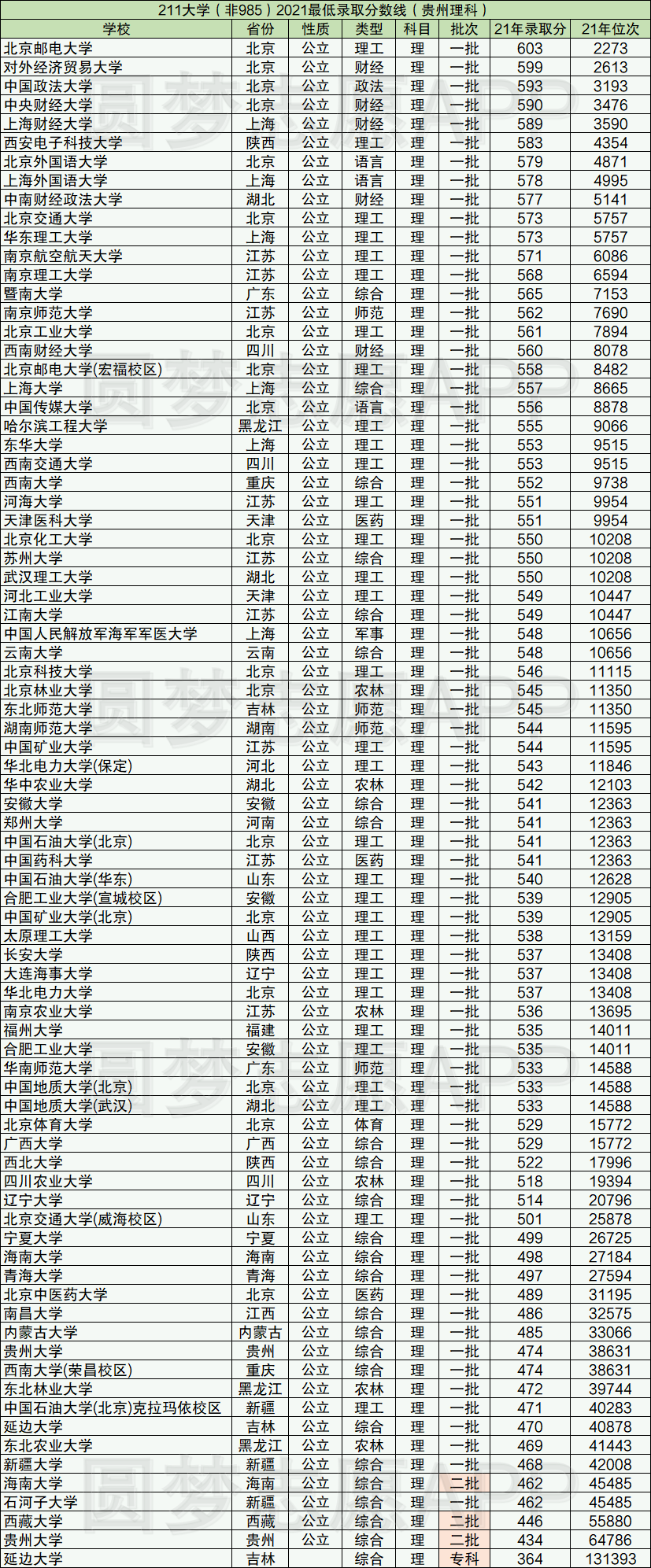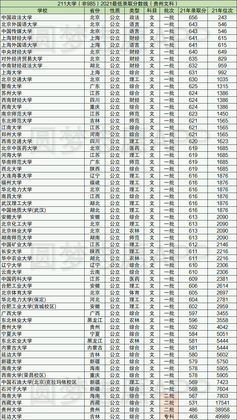 2、2021年211大学在贵州省录取最低分