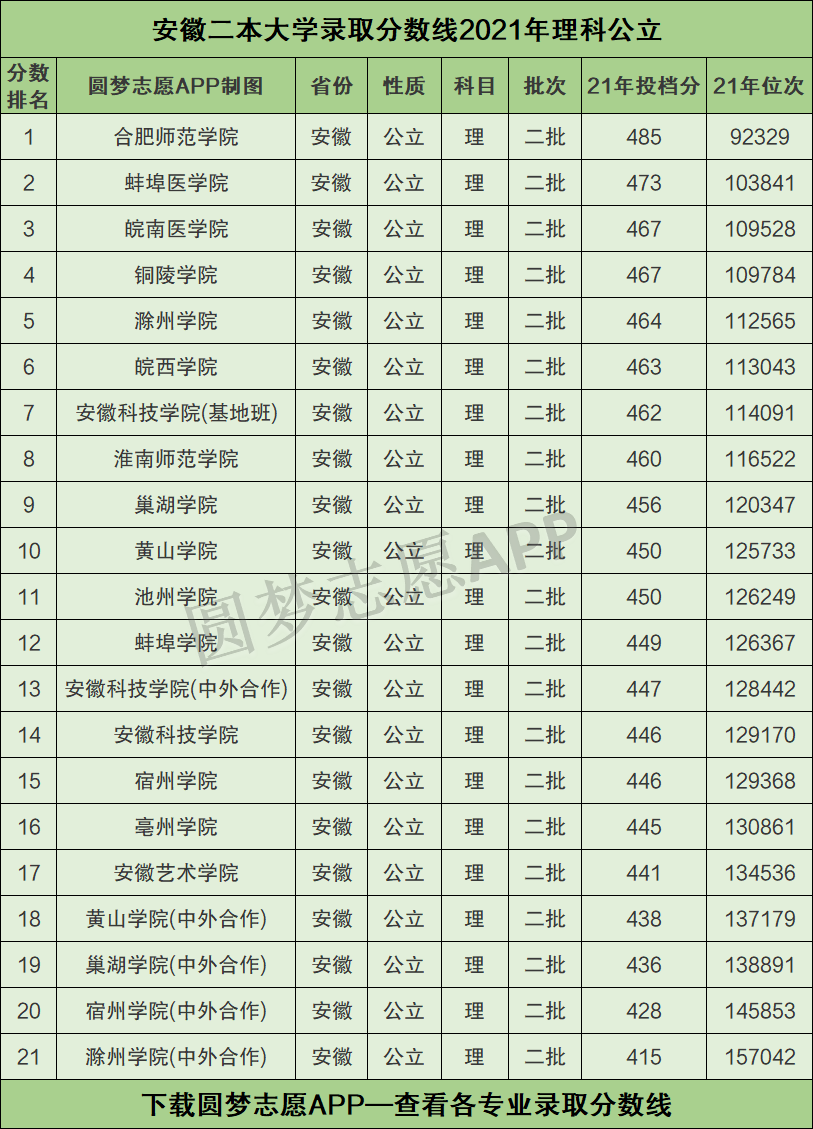 一、安徽二本大学录取分数线2021年排名(理科公立)