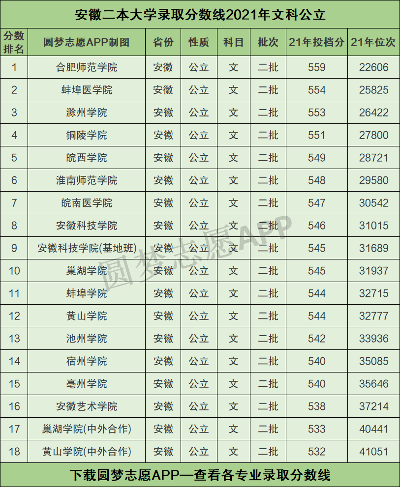 二、安徽二本大学录取分数线2021年排名(文科公立)