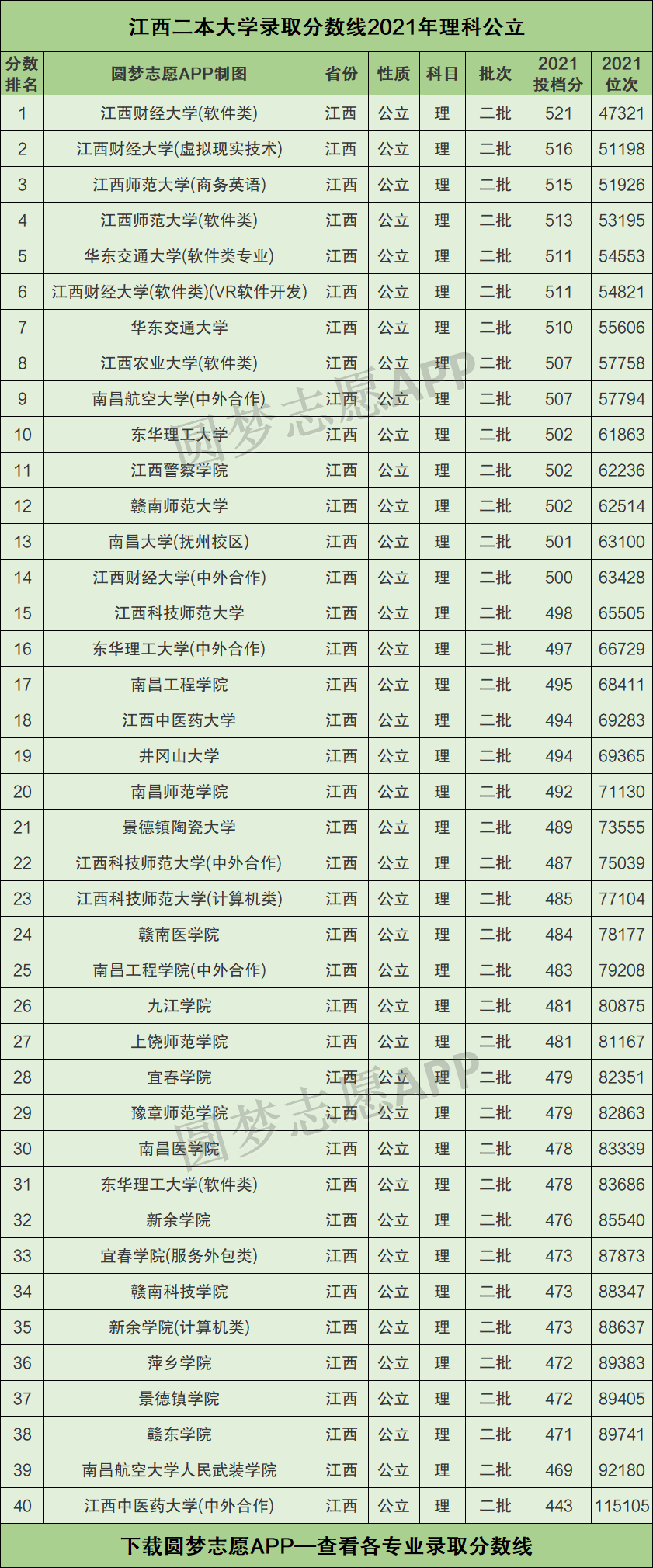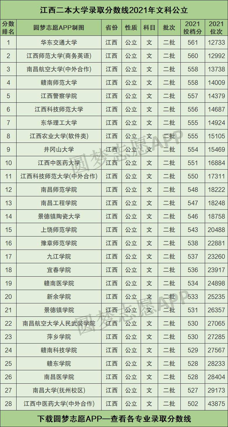 二、江西二本大学录取分数线2021年排名(文科公立)