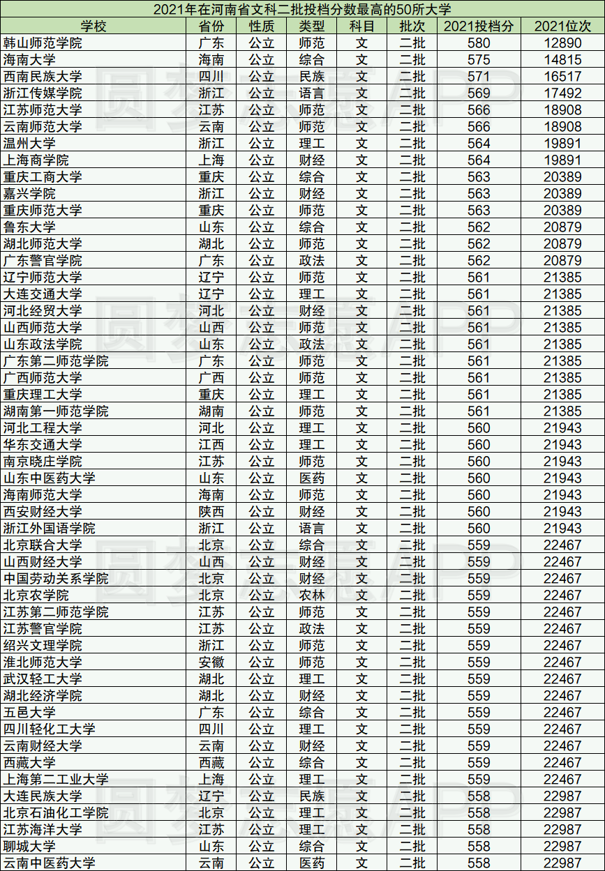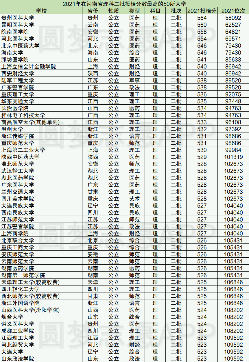 各高校在不同省份的招生计划不同因此分数线也存在差异,小编这里整理的是2021年全国二本大学在河南省本科二批次低投档分数线50强的学校名单,供大家参考。另外大家也可以通过查看其他省份的分数线情况。