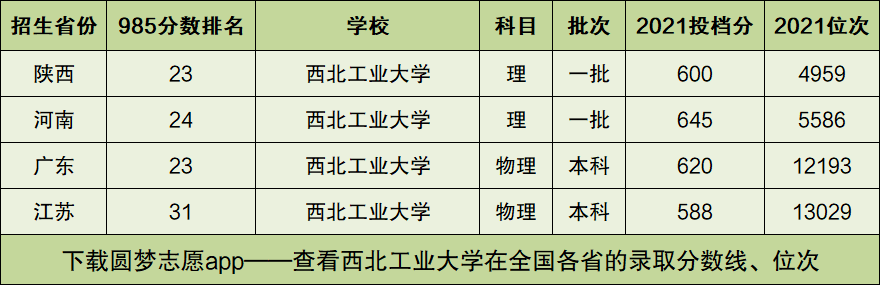 下文中,小编将以“陕西、河南、广东、江苏”这四个省为例,为大家展示西北工业大学在全国所有的985大学中的录取分数线排名情况。