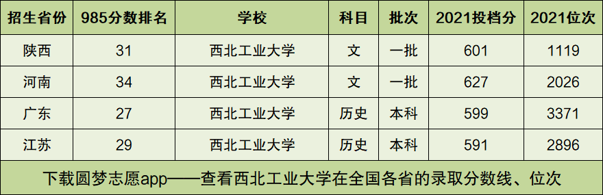 西北工业大学在广东、江苏省2021年首选物理、历史的最低投档分数线、位次可见下图。同样地,小编也根据投档分数线的高低为大家整理出了广东、江苏版本的西北工业大学在985大学中的排名!