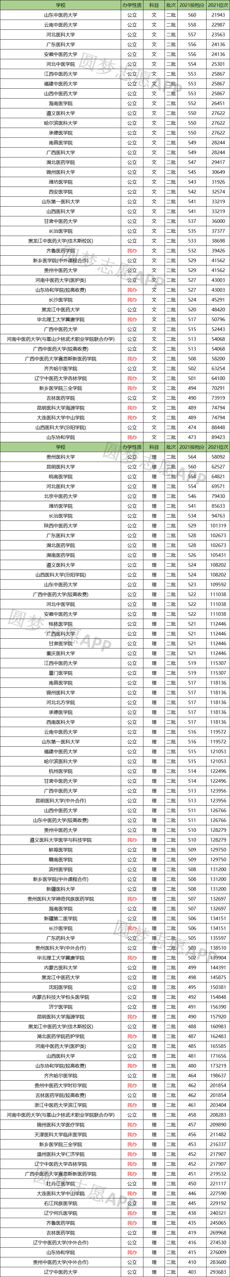文科:山东中医药大学(560分)、云南中医药大学(558分)、河北医科大学(557分)、广东医科大学(556分)、安徽中医药大学(556分);
