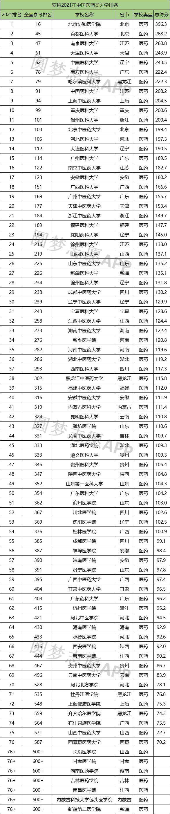 下面是本科医学院校大学排名2021年软科排名完整版: