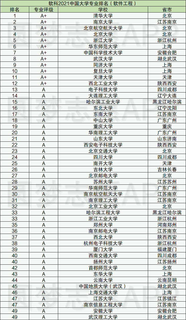 1、2021年中国大学专业排名(软件工程)前50所大学