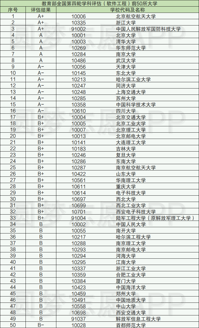 2、教育部全国第四轮学科评估(软件工程)前50所大学
