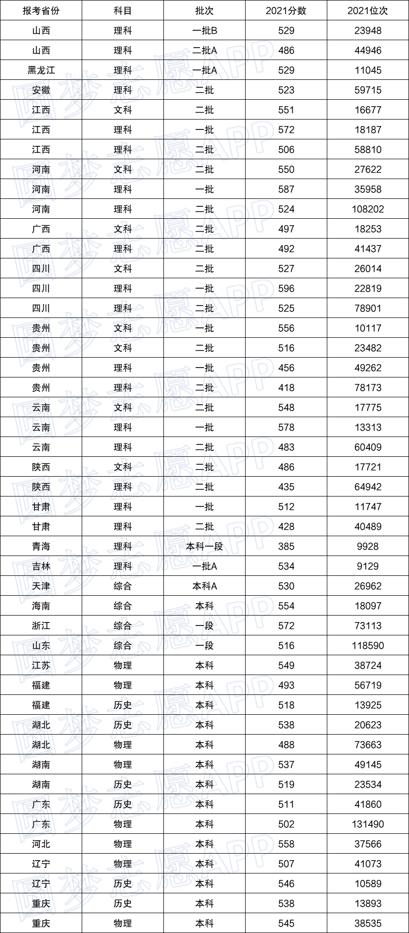下图是贵州医科大学2021年在各省市区的最低录取分数线以及录取批次情况: