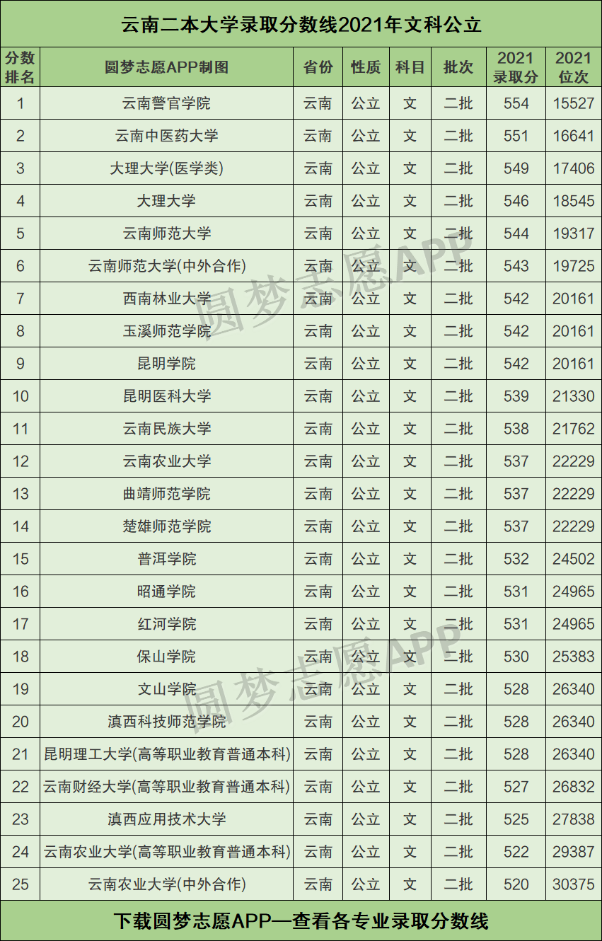 二、云南二本大学录取分数线2021年排名(文科公立)